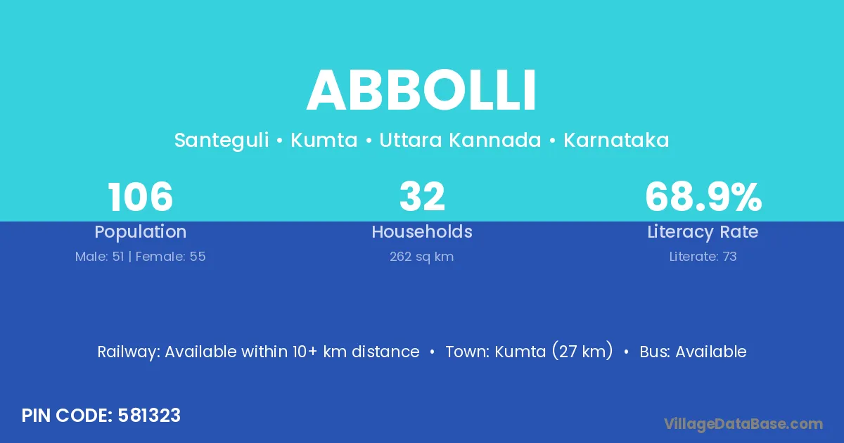 Kumta (27 km) is the nearest town to Abbolli village for major economic activities and is located approximately 27 km away.