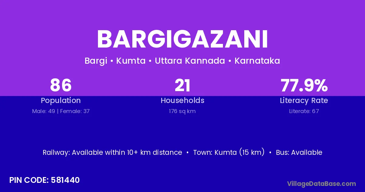 Kumta (15 km) is the nearest town to Bargigazani village for major economic activities and is located approximately 15 km away.