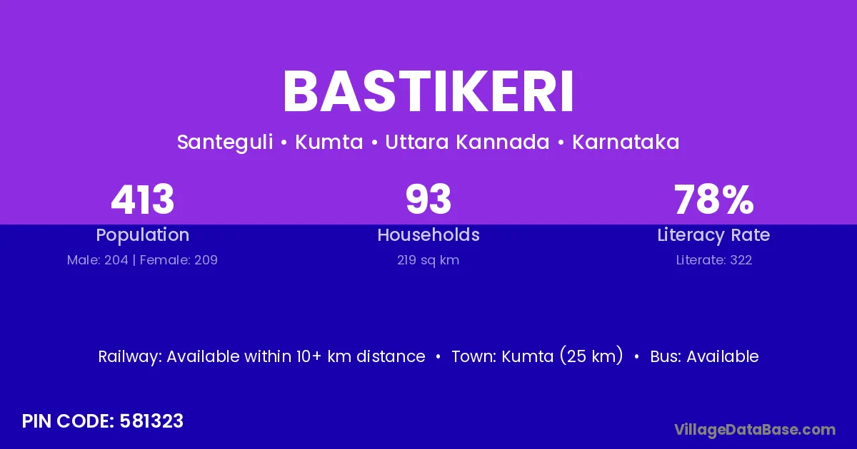 Kumta (25 km) is the nearest town to Bastikeri village for major economic activities and is located approximately 25 km away.