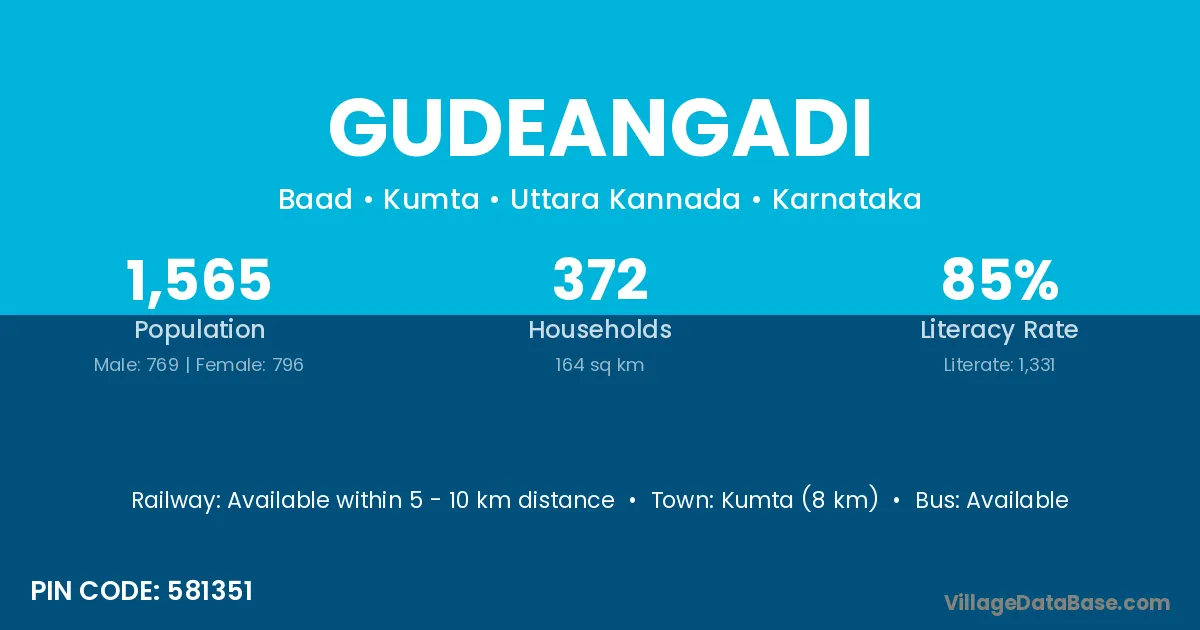 Kumta (8 km) is the nearest town to Gudeangadi village for major economic activities and is located approximately 8 km away.