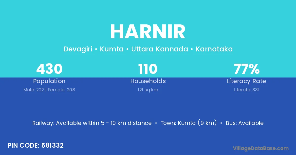 Kumta (9 km) is the nearest town to Harnir village for major economic activities and is located approximately 9 km away.