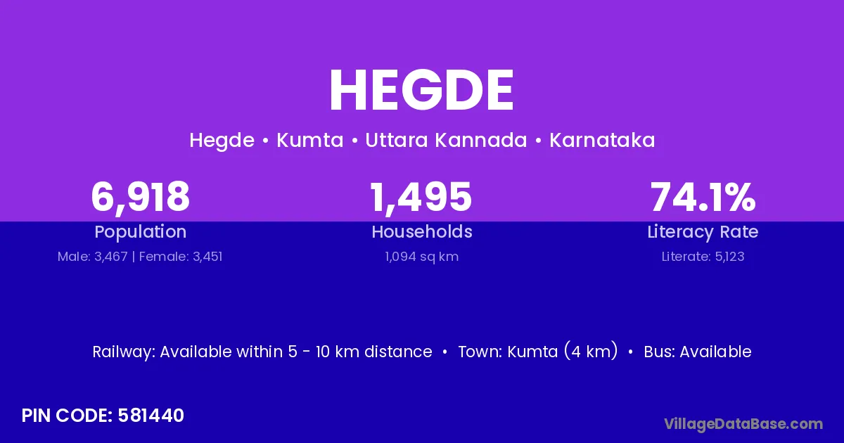 Kumta (4 km) is the nearest town to Hegde village for major economic activities and is located approximately 4 km away.
