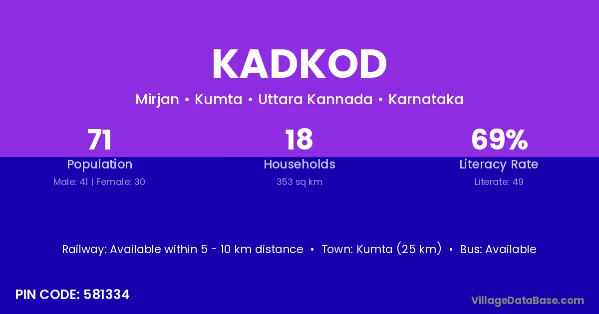 Kumta (25 km) is the nearest town to Kadkod village for major economic activities and is located approximately 25 km away.