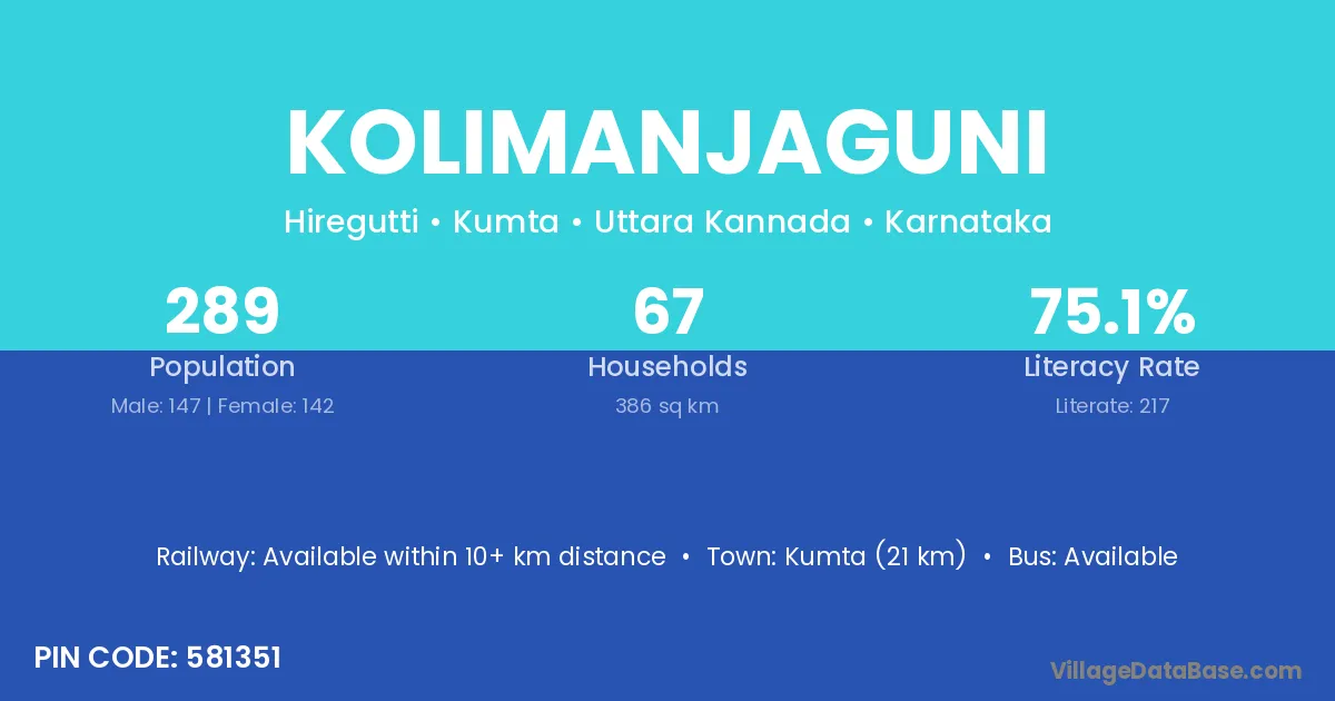 Kumta (21 km) is the nearest town to Kolimanjaguni village for major economic activities and is located approximately 21 km away.