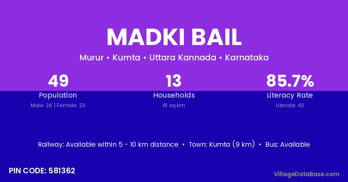 Kumta (9 km) is the nearest town to Madki Bail village for major economic activities and is located approximately 9 km away.