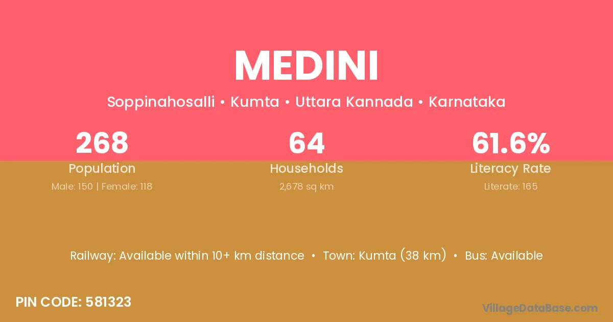 Kumta (38 km) is the nearest town to Medini village for major economic activities and is located approximately 38 km away.