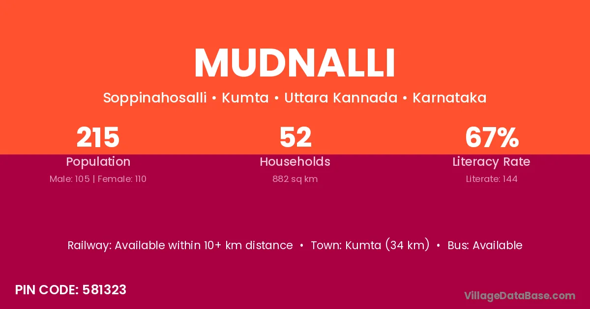 Kumta (34 km) is the nearest town to Mudnalli village for major economic activities and is located approximately 34 km away.