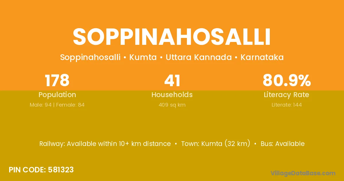 Kumta (32 km) is the nearest town to Soppinahosalli village for major economic activities and is located approximately 32 km away.