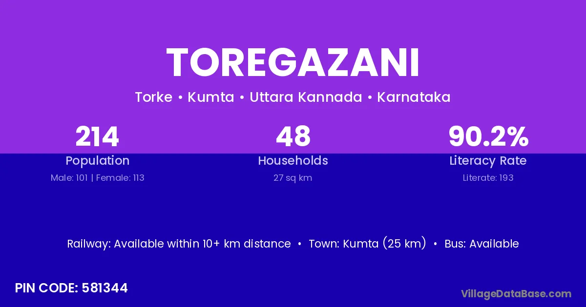 Kumta (25 km) is the nearest town to Toregazani village for major economic activities and is located approximately 25 km away.
