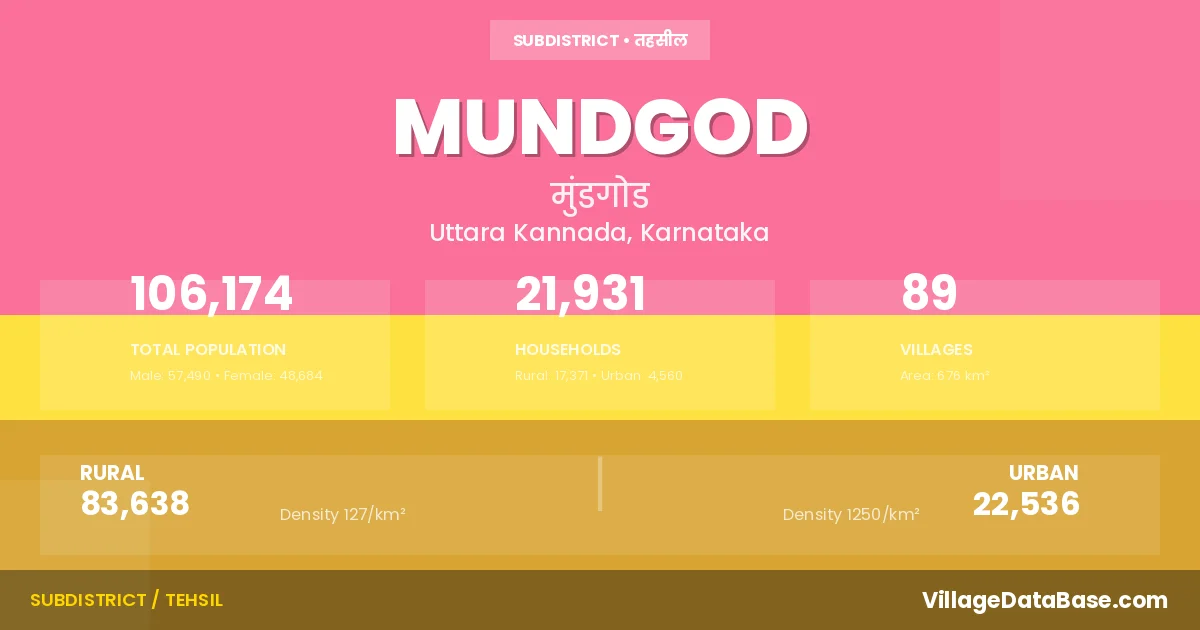 According to the 2011 census The total area of Mundgod Taluka is 676 km², with a population of 106174 people. The population density is 157 inhabitants per square kilometre, and there are approximately 21931 houses in the sub district.