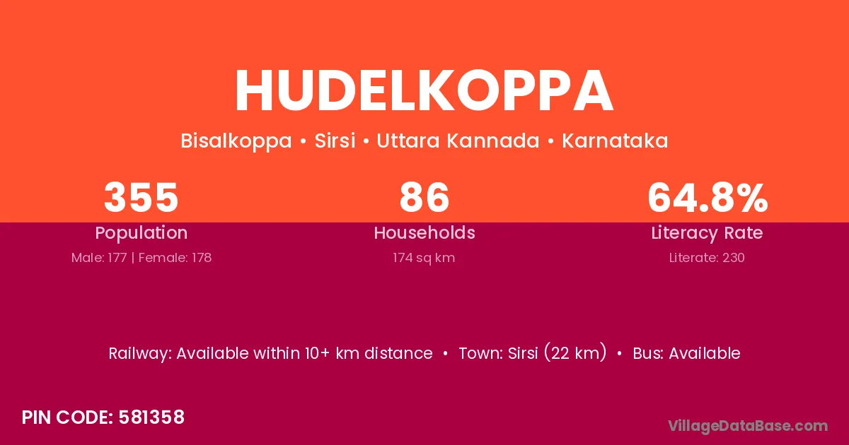 Hangal (15 km) is the nearest town to Hudelkoppa village for major economic activities and is located approximately 15 km away.