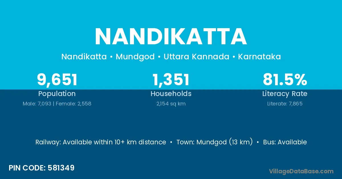 Mundgod (13 km) is the nearest town to Nandikatta village for major economic activities and is located approximately 13 km away.