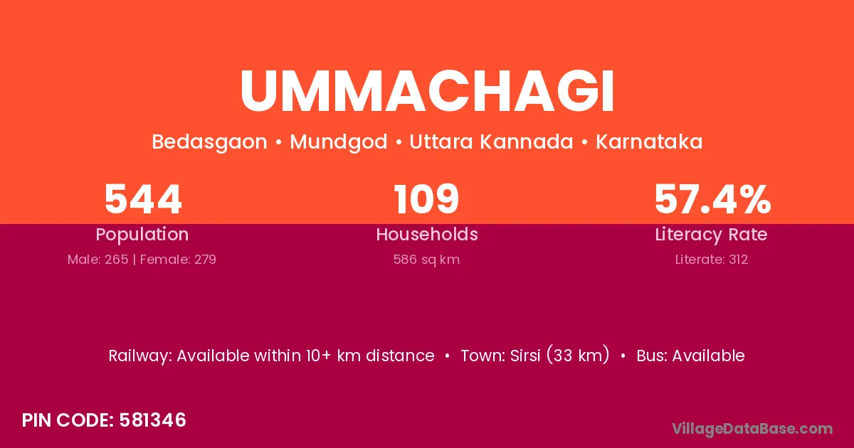 Sirsi (33 km) is the nearest town to Ummachagi village for major economic activities and is located approximately 33 km away.