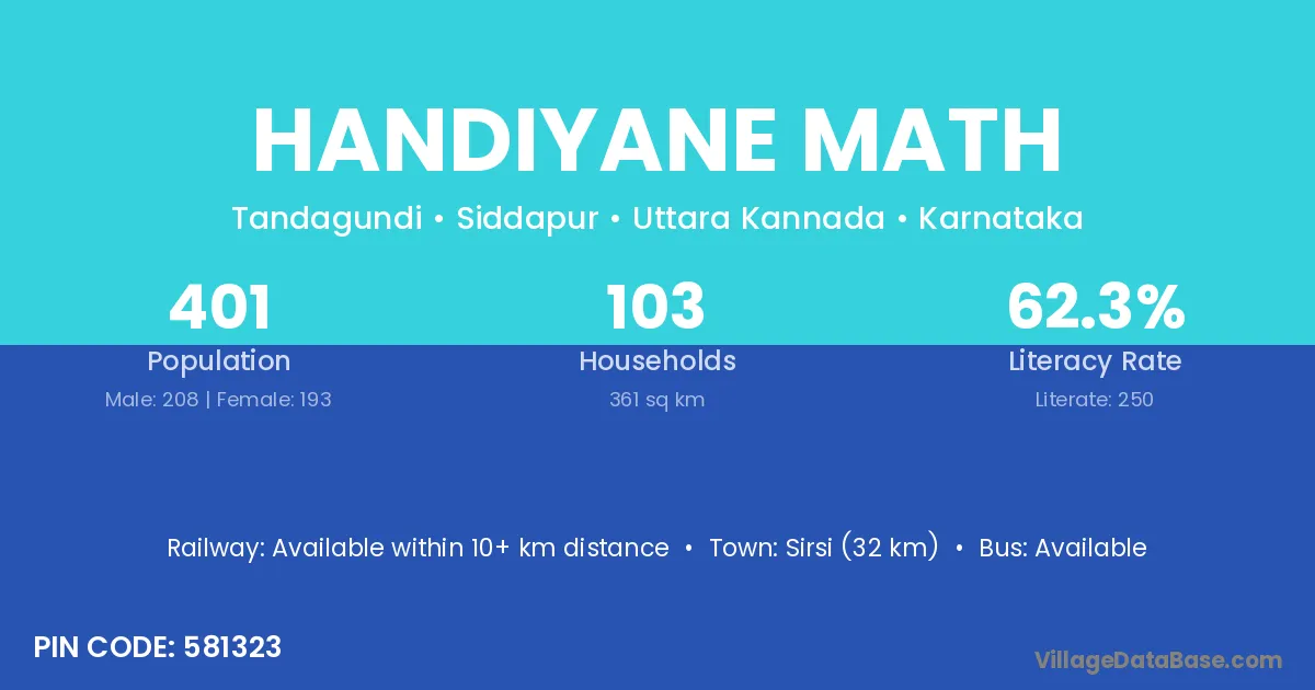 Sirsi (32 km) is the nearest town to Handiyane Math village for major economic activities and is located approximately 32 km away.
