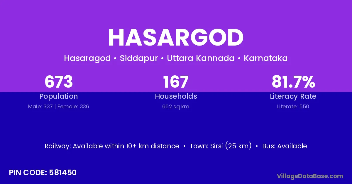 Sirsi (25 km) is the nearest town to Hasargod village for major economic activities and is located approximately 25 km away.