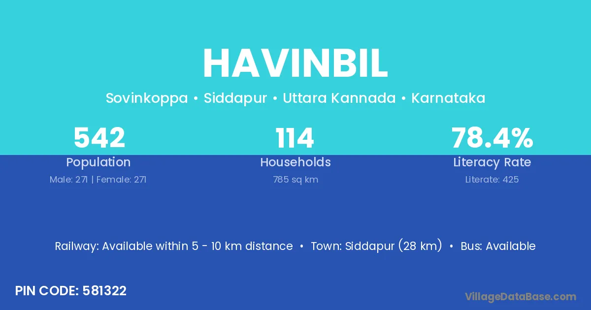 Siddapur (28 km) is the nearest town to Havinbil village for major economic activities and is located approximately 28 km away.