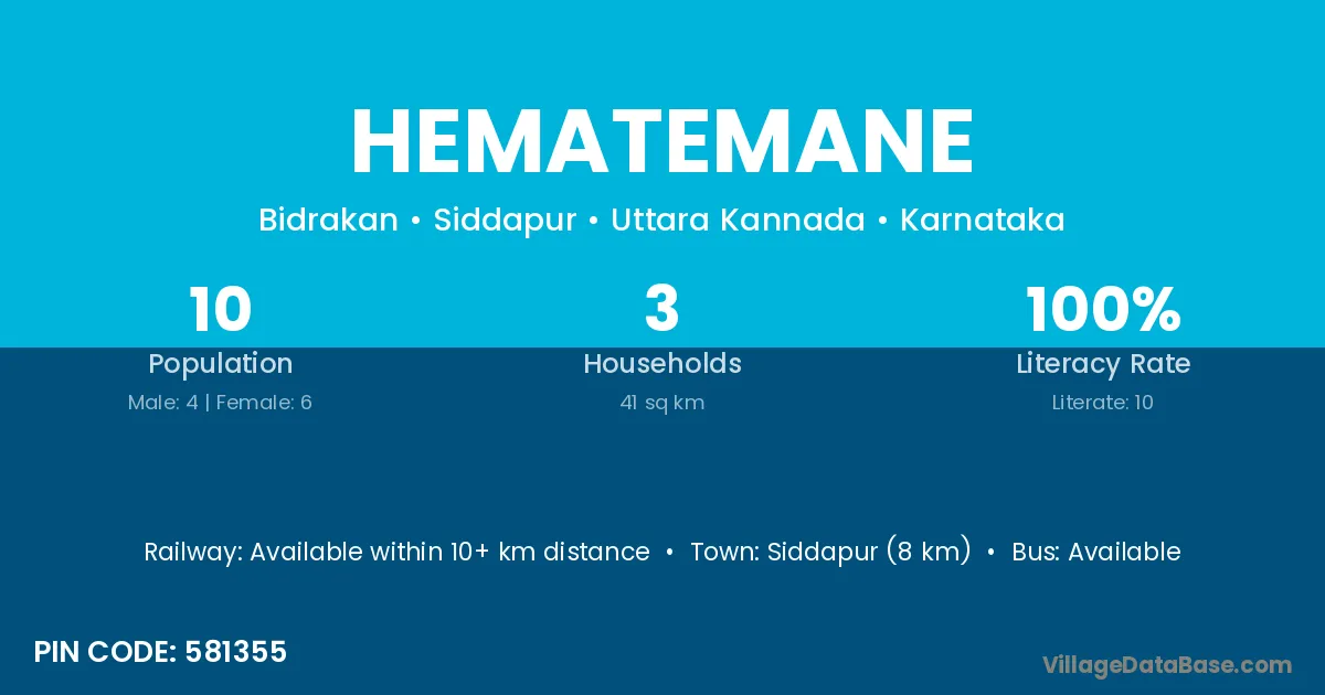 Siddapur (8 km) is the nearest town to Hematemane village for major economic activities and is located approximately 8 km away.