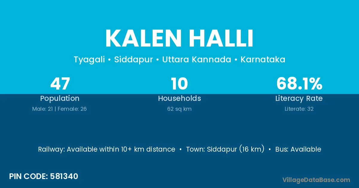 Kalen Halli village has a total population of 47 people, of which 21 are males and 26 are females.