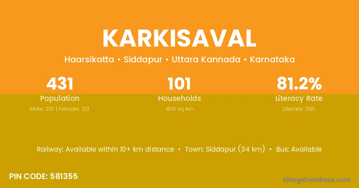 Siddapur (34 km) is the nearest town to Karkisaval village for major economic activities and is located approximately 34 km away.