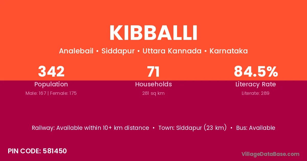 Siddapur (23 km) is the nearest town to Kibballi village for major economic activities and is located approximately 23 km away.