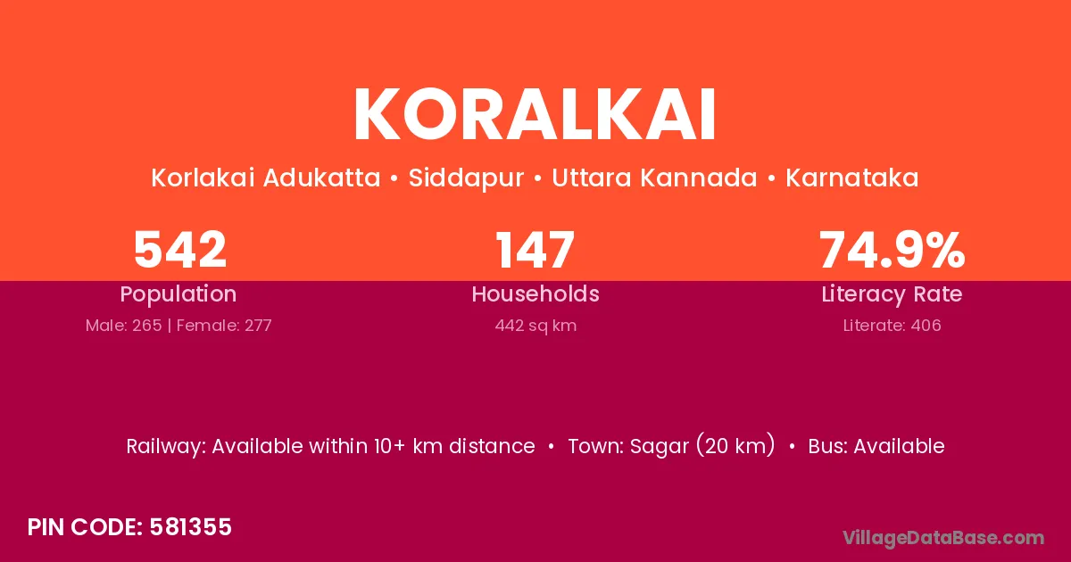 Koralkai village has a total population of 542 people, of which 265 are males and 277 are females.