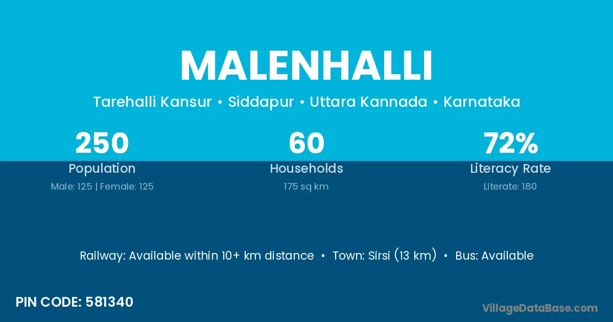 Sirsi (13 km) is the nearest town to Malenhalli village for major economic activities and is located approximately 13 km away.
