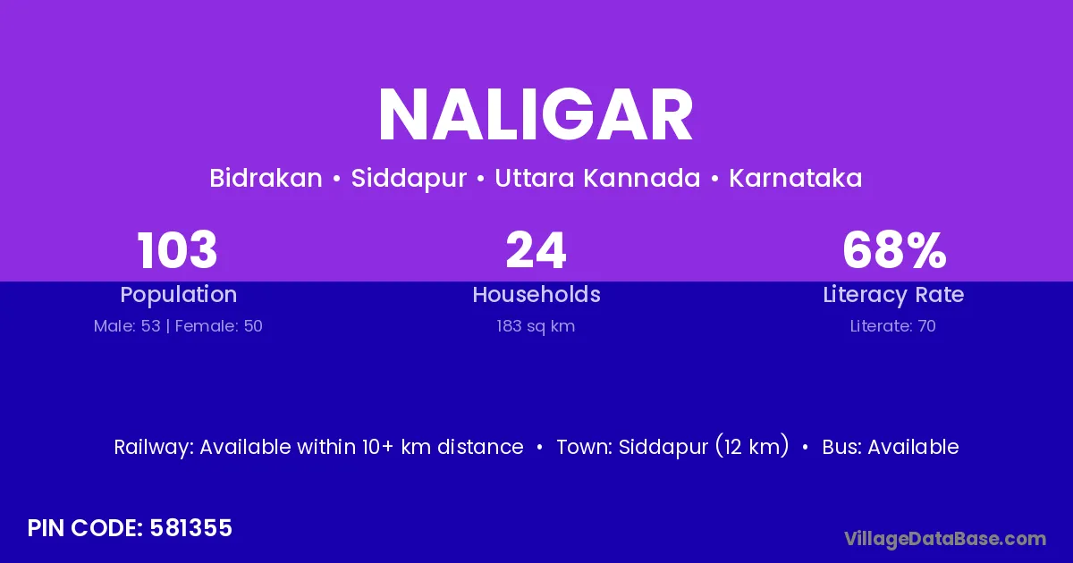 Siddapur (12 km) is the nearest town to Naligar village for major economic activities and is located approximately 12 km away.
