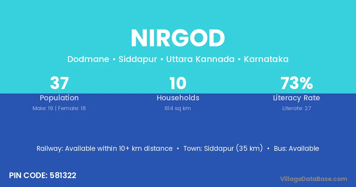 Siddapur (35 km) is the nearest town to Nirgod village for major economic activities and is located approximately 35 km away.