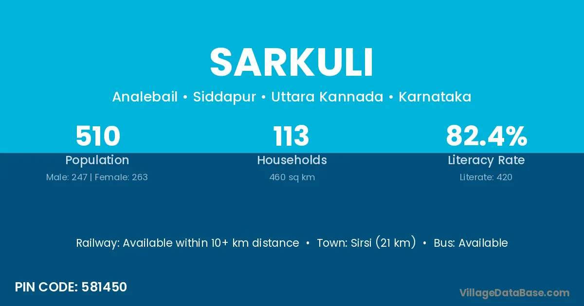 Sirsi (21 km) is the nearest town to Sarkuli village for major economic activities and is located approximately 21 km away.