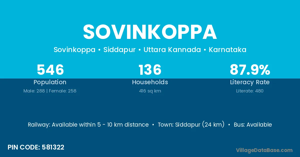 Siddapur (24 km) is the nearest town to Sovinkoppa village for major economic activities and is located approximately 24 km away.