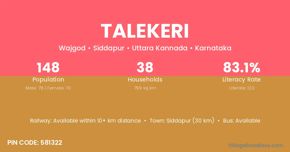 Siddapur (30 km) is the nearest town to Talekeri village for major economic activities and is located approximately 30 km away.
