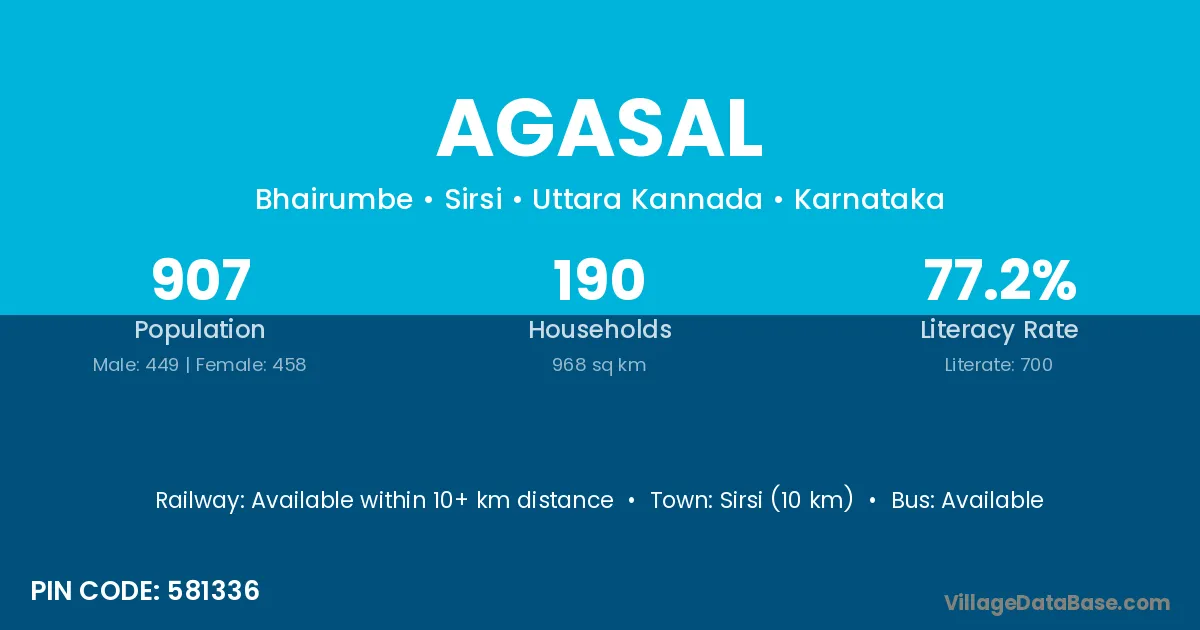 Sirsi (10 km) is the nearest town to Agasal village for major economic activities and is located approximately 10 km away.