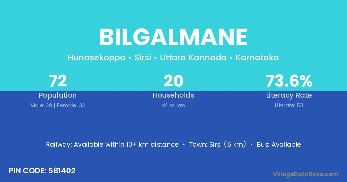 Sirsi (6 km) is the nearest town to Bilgalmane village for major economic activities and is located approximately 6 km away.