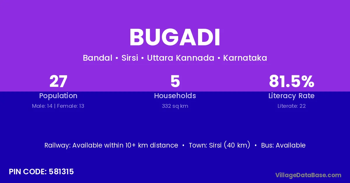 Sirsi (40 km) is the nearest town to Bugadi village for major economic activities and is located approximately 40 km away.