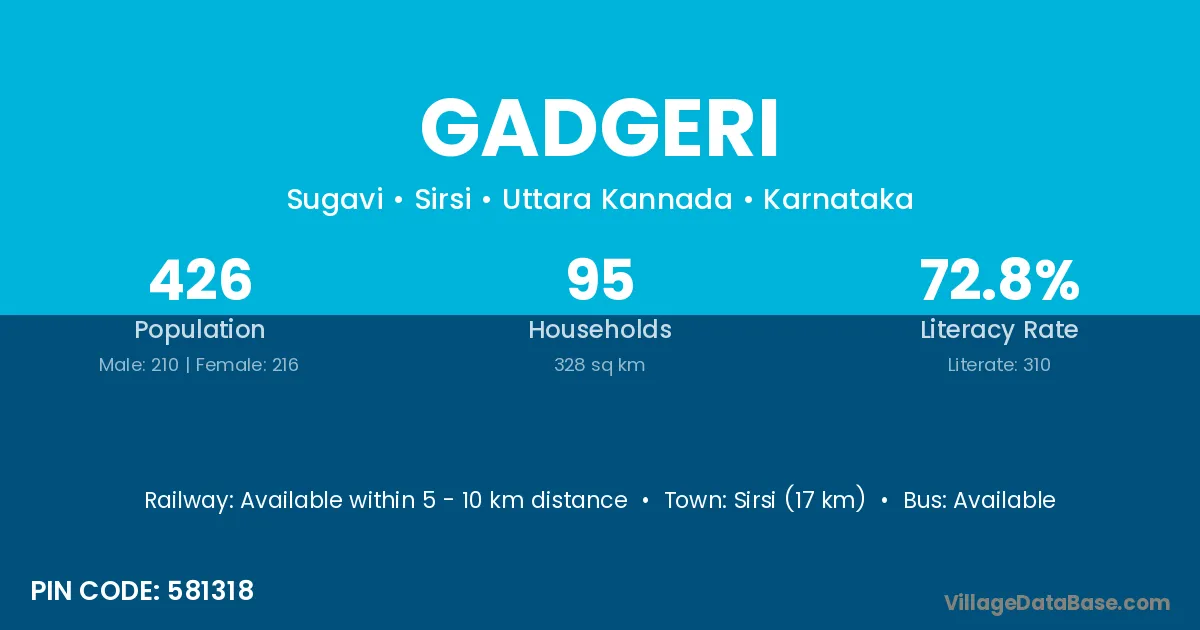 Sirsi (17 km) is the nearest town to Gadgeri village for major economic activities and is located approximately 17 km away.