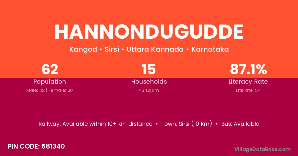 Hannondugudde village has a total population of 62 people, of which 32 are males and 30 are females.