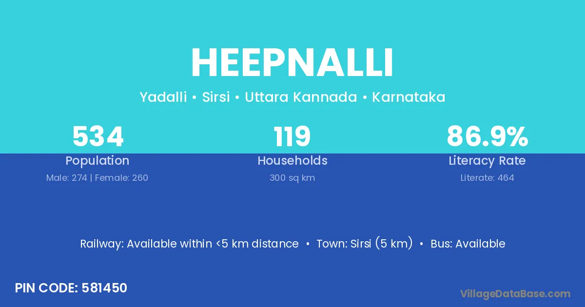 Sirsi (5 km) is the nearest town to Heepnalli village for major economic activities and is located approximately 5 km away.
