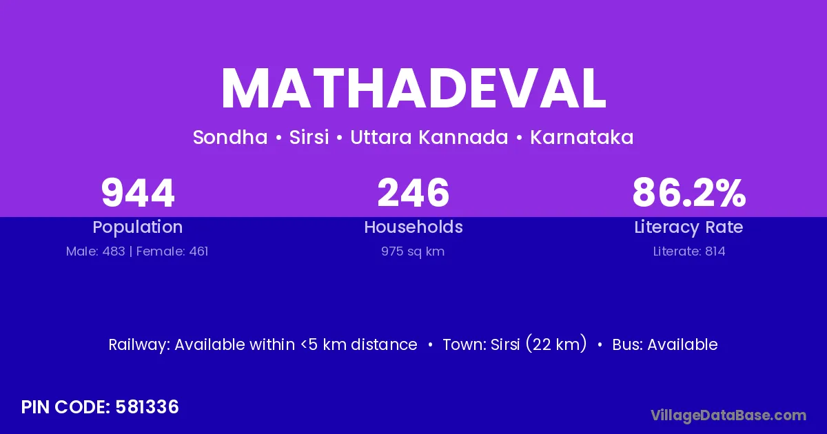 Sirsi (22 km) is the nearest town to Mathadeval village for major economic activities and is located approximately 22 km away.