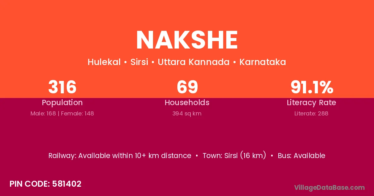 Sirsi (16 km) is the nearest town to Nakshe village for major economic activities and is located approximately 16 km away.