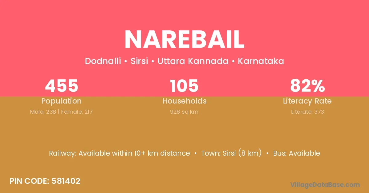 Sirsi (8 km) is the nearest town to Narebail village for major economic activities and is located approximately 8 km away.