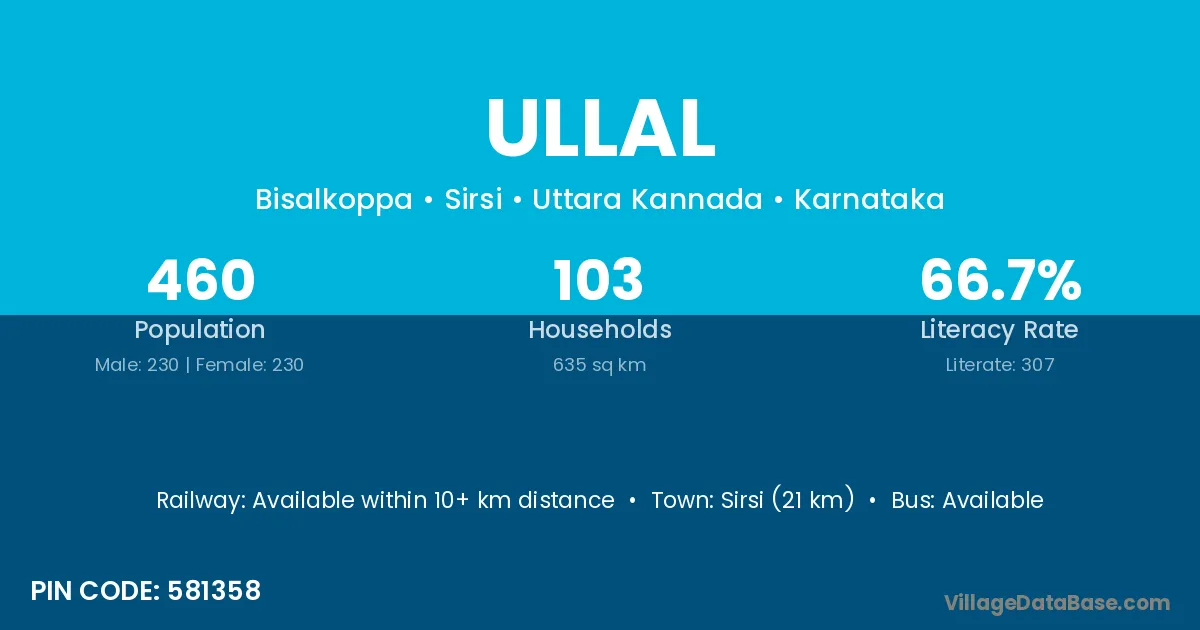 Sirsi (21 km) is the nearest town to Ullal village for major economic activities and is located approximately 21 km away.