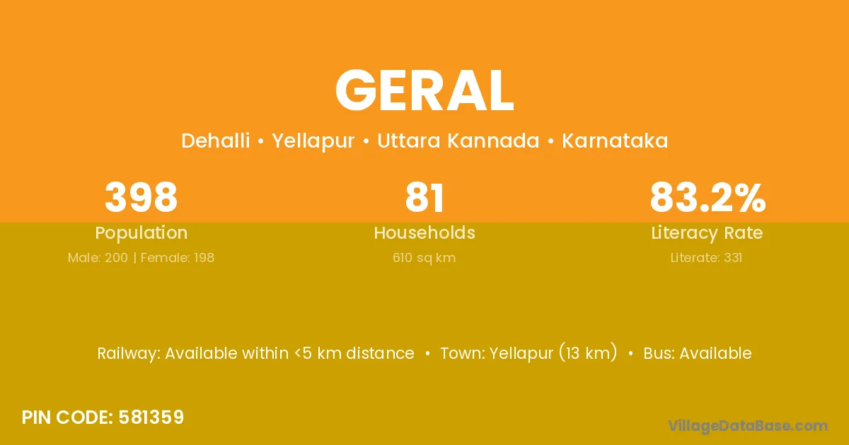 Yellapur (13 km) is the nearest town to Geral village for major economic activities and is located approximately 13 km away.