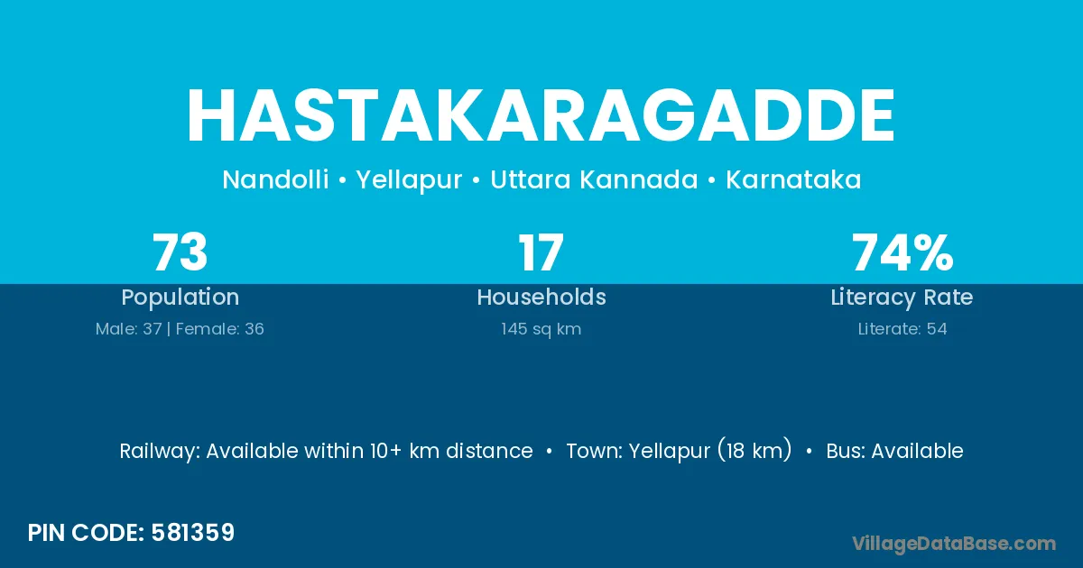Yellapur (18 km) is the nearest town to Hastakaragadde village for major economic activities and is located approximately 18 km away.