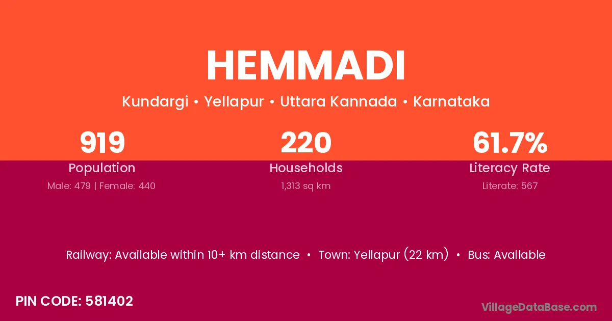 Yellapur (22 km) is the nearest town to Hemmadi village for major economic activities and is located approximately 22 km away.