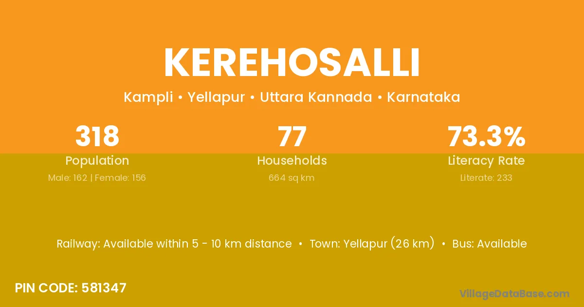 Yellapur (26 km) is the nearest town to Kerehosalli village for major economic activities and is located approximately 26 km away.