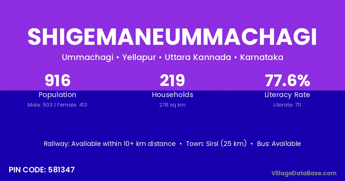 Sirsi (25 km) is the nearest town to Shigemaneummachagi village for major economic activities and is located approximately 25 km away.