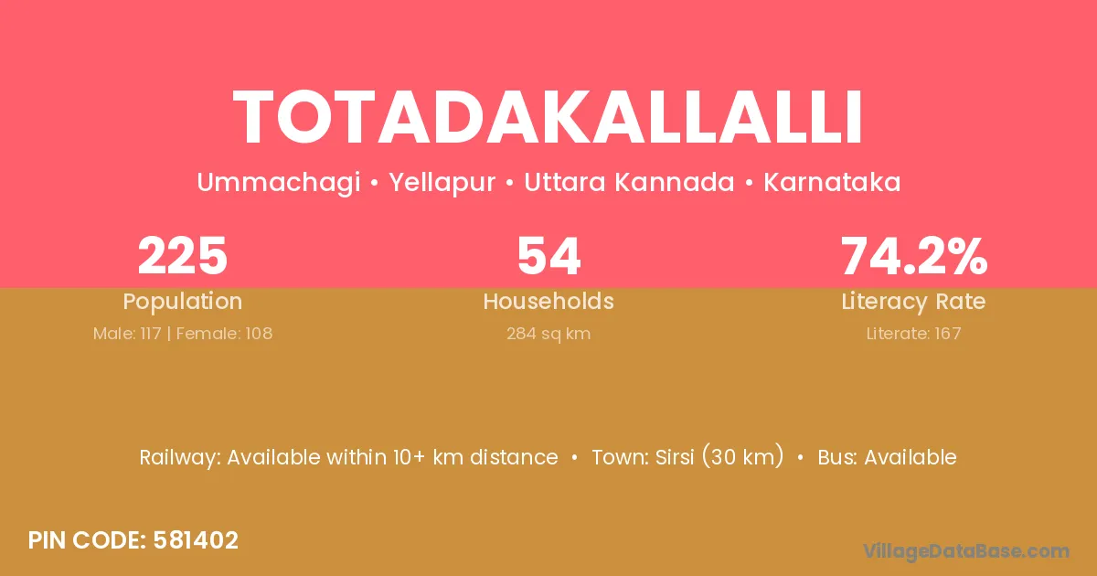 Sirsi (30 km) is the nearest town to Totadakallalli village for major economic activities and is located approximately 30 km away.