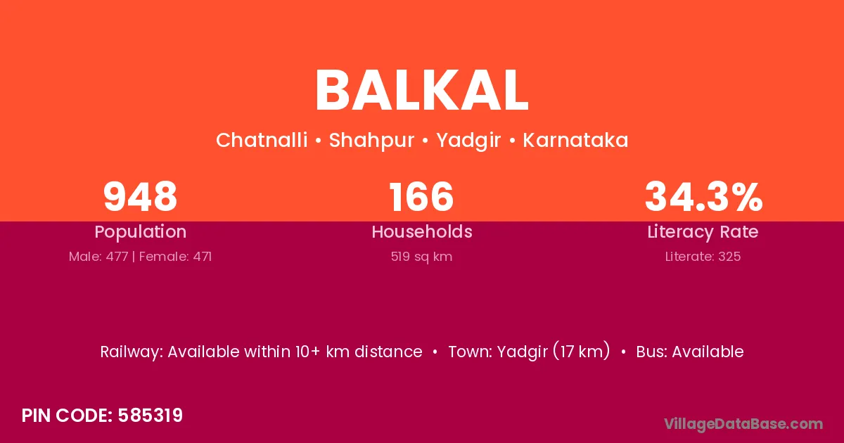 Yadgir (17 km) is the nearest town to Balkal village for major economic activities and is located approximately 17 km away.