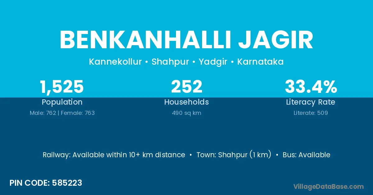 Shahpur (1 km) is the nearest town to Benkanhalli Jagir village for major economic activities and is located approximately 1 km away.