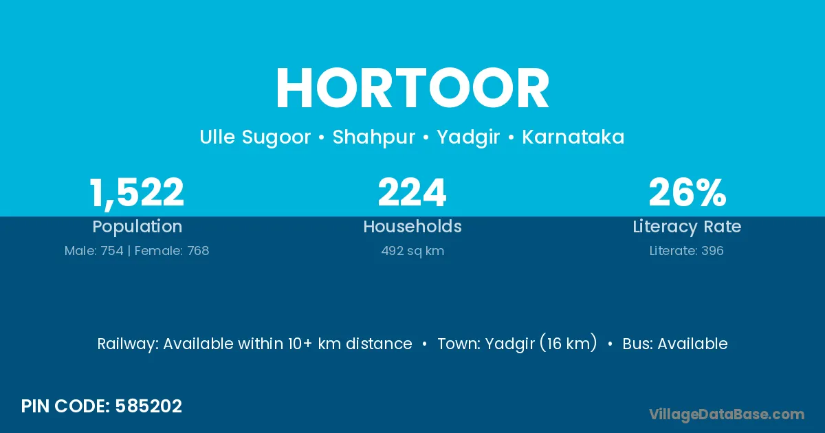 Yadgir (16 km) is the nearest town to Hortoor village for major economic activities and is located approximately 16 km away.